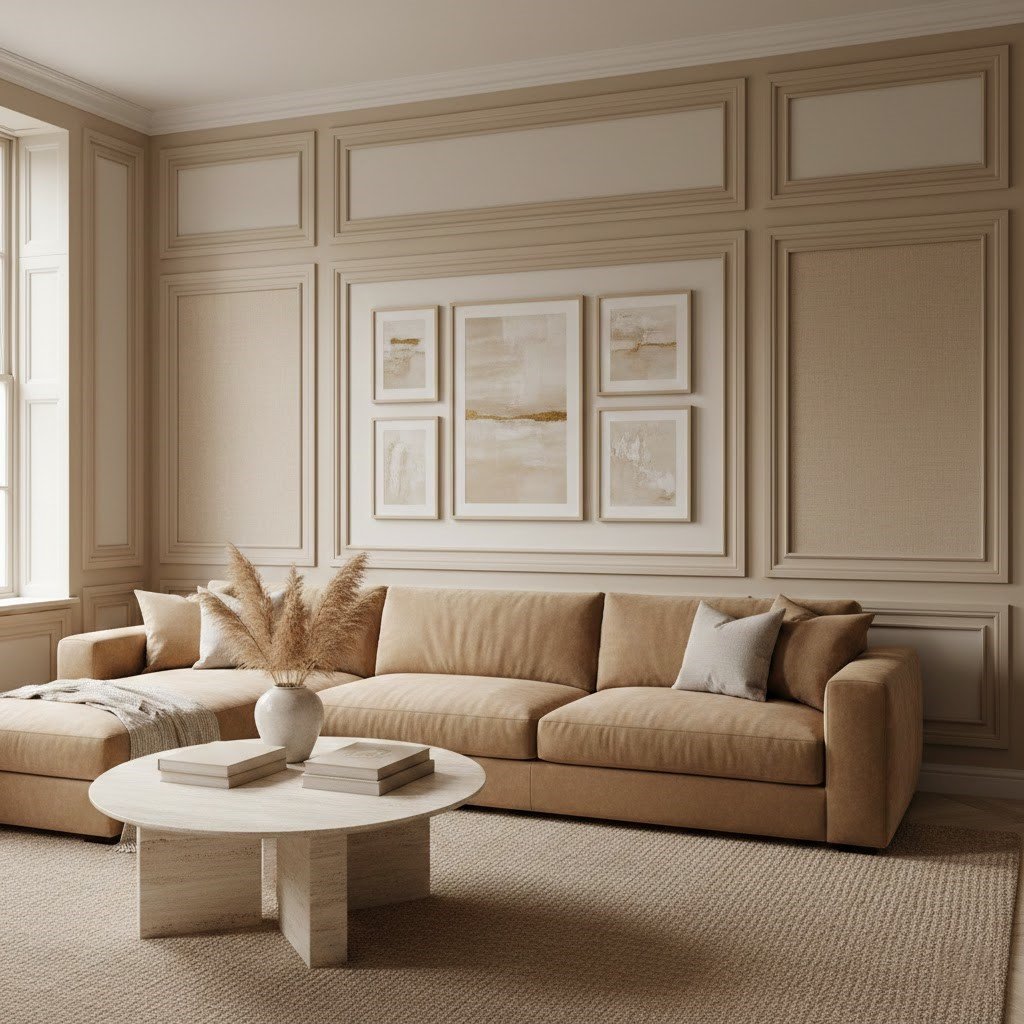 If you truly want a luxury living room on a budget, nothing beats the elegance of architectural details. ‘Box Molding’ (or Picture Frame Molding) involves gluing or nailing thin wood trims onto your walls in large rectangular shapes. The secret to making this look expensive is ‘Color Drenching’ painting the wall and the wood trim the exact same color.